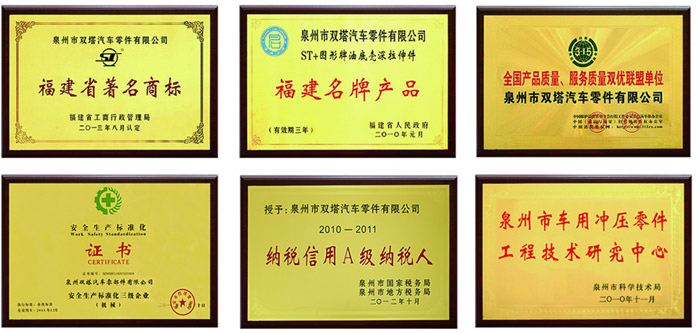 2005年由福建省商標(biāo)認(rèn)定委員會(huì)認(rèn)定“ST”為“福建省著名商標(biāo)”,并多次榮獲各級(jí)政府及行業(yè)頒發(fā)的 “明星企業(yè)”、“福建省誠(chéng)信經(jīng)商承諾企業(yè)”、“高新科技”等榮譽(yù)證書(shū),“雙塔”牌汽配系列產(chǎn)品已得到了國(guó)內(nèi)外眾多客商的認(rèn)可。